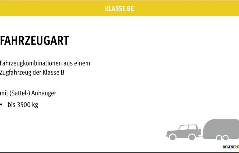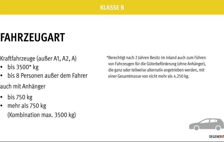 Kraftfahrzeuge – ausgenommen Kraftfahrzeuge der Klassen AM, A1, A2 und A – mit einer zulässigen Gesamtmasse von nicht mehr als 3 500 kg, die zur Beförderung von nicht mehr als acht Personen außer dem Fahrzeugführer ausgelegt und gebaut sind (auch mit Anhänger mit einer zulässigen Gesamtmasse von nicht mehr als 750 kg oder mit Anhänger über 750 kg zulässiger Gesamtmasse, sofern 4250 kg zulässige Gesamtmasse der Kombination nicht überschritten wird).