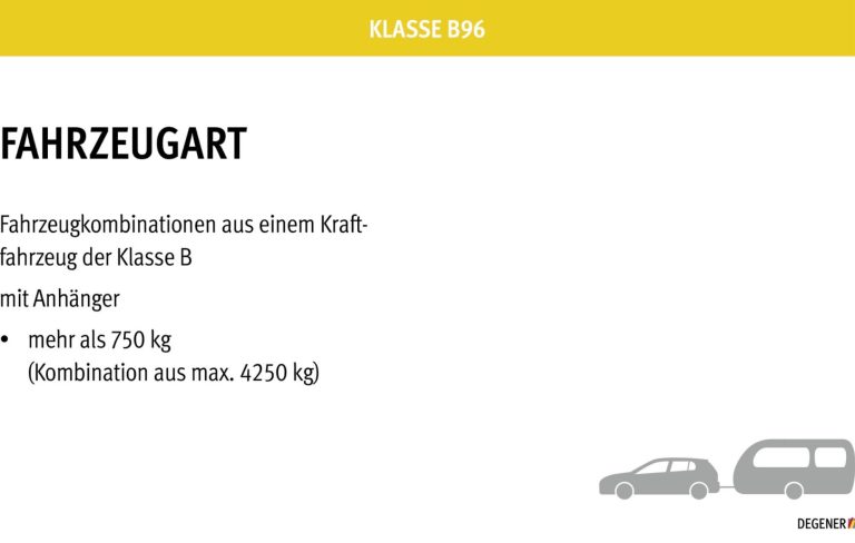 Eine theoretische und praktische Prüfung sind nicht vorgeschrieben. Es findet eine Fahrerschulung in der Fahrschule statt. Nach Aushändigung einer Bescheinigung und Vorlage bei der Behörde wird die Klasse B96 in den Führerschein eingetragen.